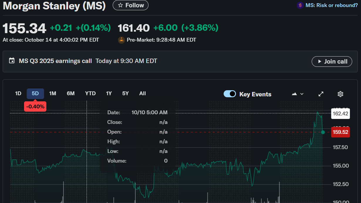 Morgan Stanley (NYSE: MS) stock closed at $155.34, up 0.14%, and traded 4.25% higher pre-market at $162.00 after reporting third-quarter 2025 earnings on October 14, 2025.