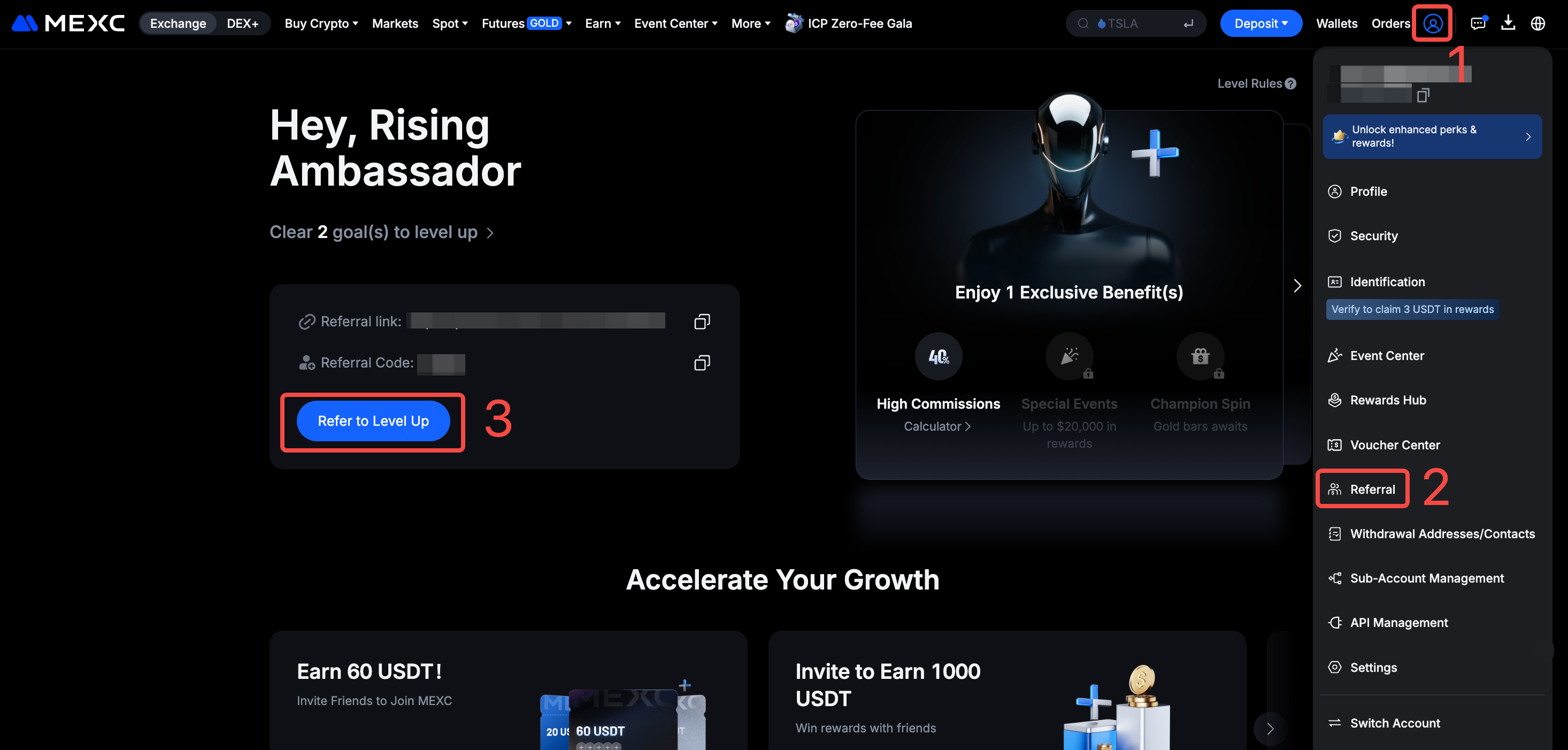 به وب سایت رسمی MEXC مراجعه کرده و وارد حساب کاربری خود شوید. روی آیکون کاربری در گوشه بالای سمت راست کلیک کرده و گزینه [رفرال] را انتخاب کنید.