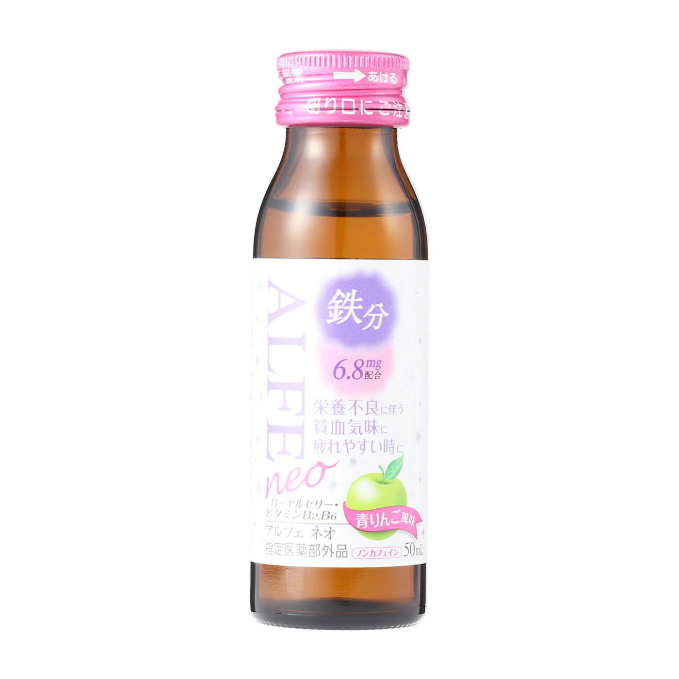 大正製薬の「アルフェネオ」は、1日分の鉄分6.8mgとビタミンB群やマグネシウム、カルシウムなどを配合。青りんご風味で手軽に飲みやすい点が特徴。試飲したモニターからは、「リンゴジュースのような味わい」「フルーティでクセがない」「口当たりが良く、飲みやすい」といった声が多く挙がりました。栄養ドリンクの独特な苦味や薬のような味わいが少なく、甘味と酸味の効いたリンゴジュースを飲むような感覚ですっきり飲めたという意見が多く、好印象でした。また、ノンカフェインで1瓶4kcalと低カロリーな点が、カロリーが気になる人や妊娠授乳期でカフェインを避けたい人にとってはうれしいポイントです。飲みやすさを重視する人や貧血気味になりそうなときに手軽に鉄分や栄養を補給したい人や寝る前に飲む栄養ドリンクを求めている人におすすめといえます。