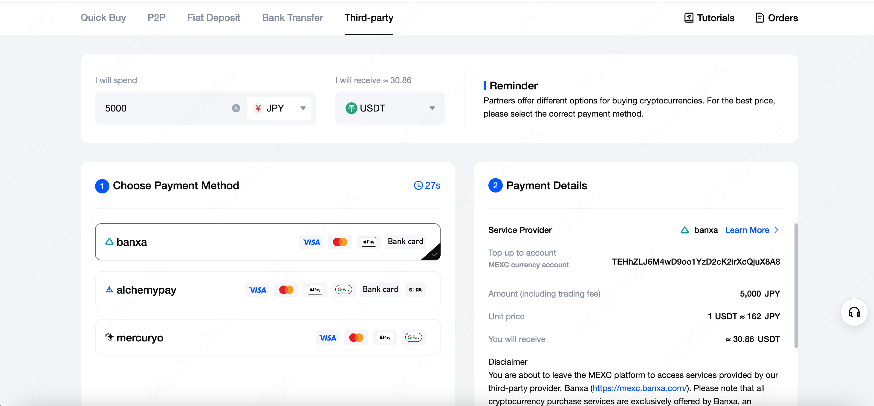 MEXC works with several third-party payment platforms to provide an easy way to purchase: