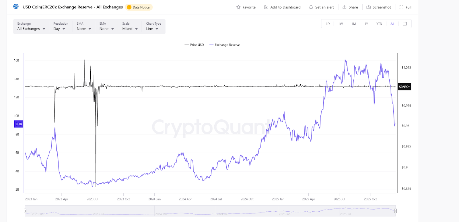 USDC, however, presents a completely different picture. Starting in late November, a large amount of USDC was withdrawn from exchanges, with exchange reserves plummeting from $15 billion to around $9 billion, a drop of 40%. As a leading compliant stablecoin, USDC's main users are primarily US institutions and compliant funds. They represent the institutional faction in the market. Currently, it's clear that this group is accelerating its exit.