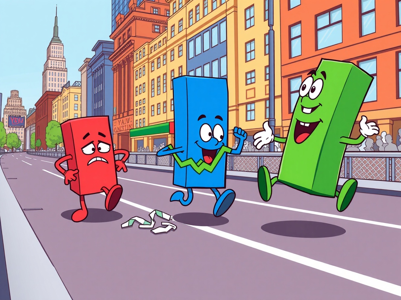 A vibrant cartoon showing the major US indexes close mixed with charts displaying different emotions on Wall Street.