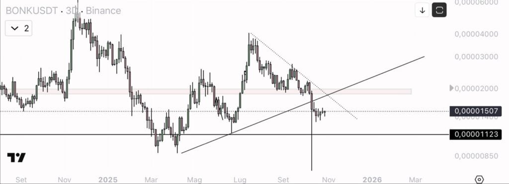 This line has supported Bonk’s recovery throughout the year, and price action around it will decide if the token can continue moving upward.