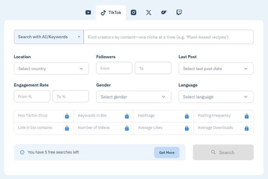 The 40+ advanced filters let you narrow by platform, follower count, location, engagement rate, posting frequency, and even specific bio keywords.