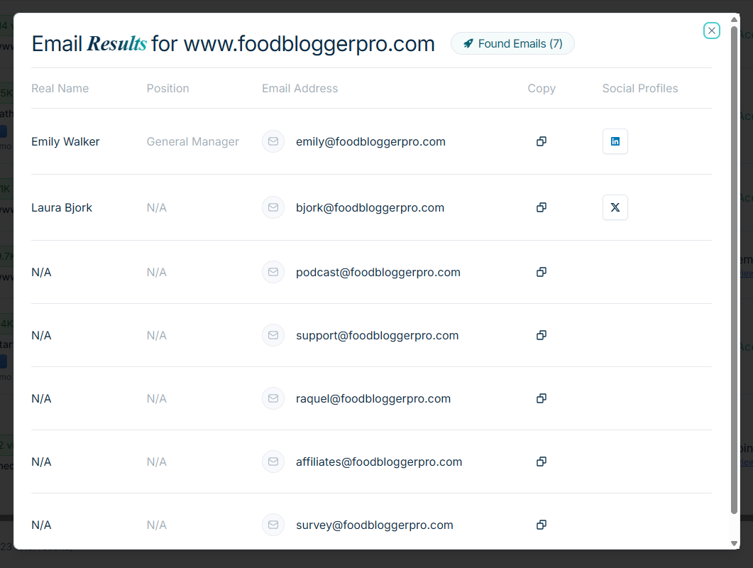 It even finds Linkedin and Twitter (X) profiles for some affiliates, so you can DM them directly if they’re more active on social media than email.