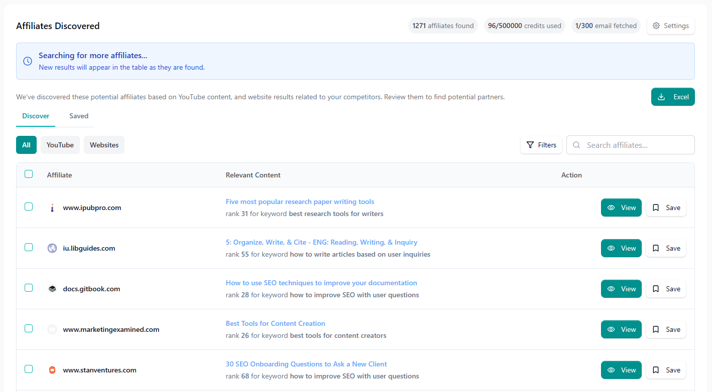 • Finds 500-750+ relevant affiliates instantly