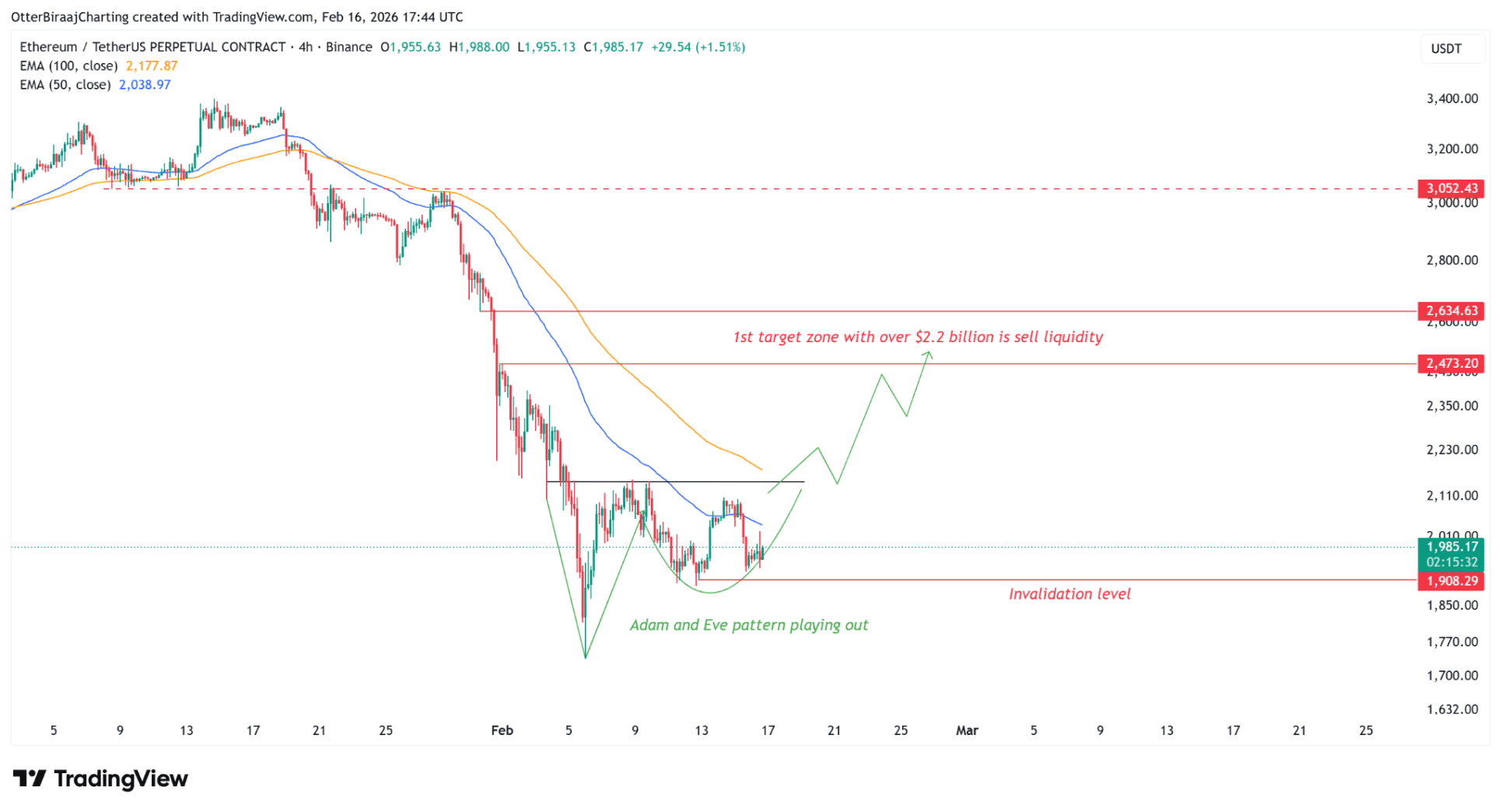 Op de vier-uurs grafiek tekent zich een zogenoemd Adam and Eve bodempatroon af. Dit technische patroon bestaat uit een scherpe V-vormige daling gevolgd door een geleidelijke afronding. Een doorbraak boven de 2.150 dollar zou het patroon bevestigen, met een mogelijk koersdoel tussen de 2.473 en 2.634 dollar.