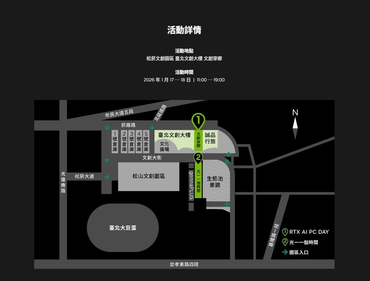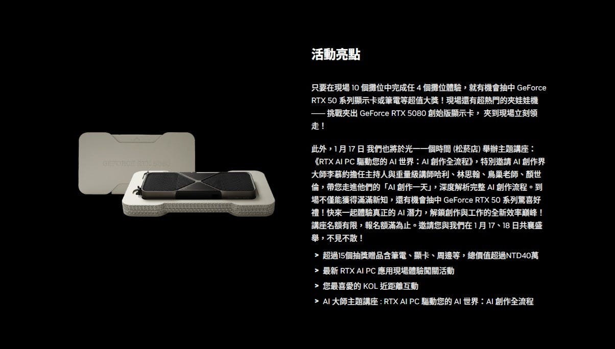 NVIDIA將在2026年1月17日與18日兩日在松菸文創園區的文創大樓文創穿廊舉辦RTX AI PC DAY活動,邀請NVIDIA RTX合作夥伴在活動現場展示最新GeForce RTX 50系列桌機、筆電與最新應用,各品牌也將在指定時間邀請合作的KOL與民眾互動,同時1月17日也將在鄰近的「光一一個時間(松菸店」舉辦AI相關主題講座。