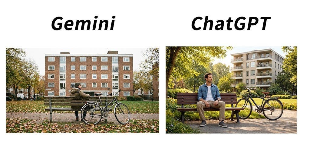▲考驗AI對空間和距離的掌握度。Gemini能夠正確繪製人物和腳踏車比例,不過背景建築的比例略有失準。Gemini在此展現出圖片物件的協調感,單車自然地靠在長椅邊,能滿足圖片條件需求且不違背物理作用,且構圖較為合理。▲ChatGPT在空間距離的掌握上似乎較為準確,不過整體有明顯的AI感。差異在於ChatGPT把繪圖條件的物件都放到圖中,但沒考慮到物件與物件之間的互動,且單車不會在無支撐的情況下直立,使得照片有明顯的AI感。▲在空間距離方面,Gemini和ChatGPT目前皆有可能出錯。但Gemini在滿足繪圖條件的情況下,讓物件之間保有合理的互動與作用,減少不協調的感覺。