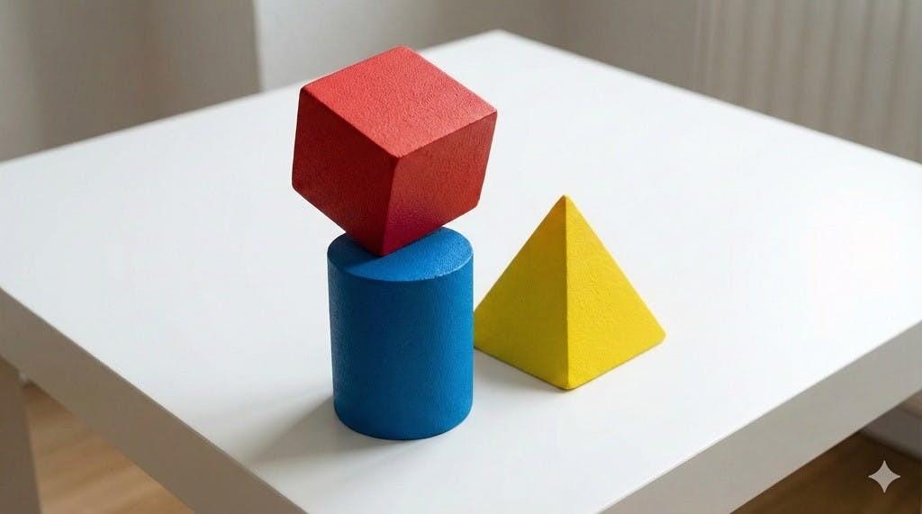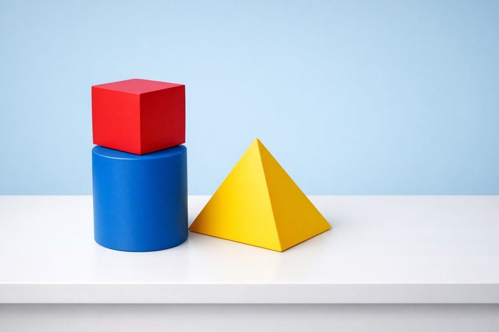 一個紅色立方體放在藍色圓柱體上方,而圓柱體位於白色桌子上一個黃色金字塔的左側。