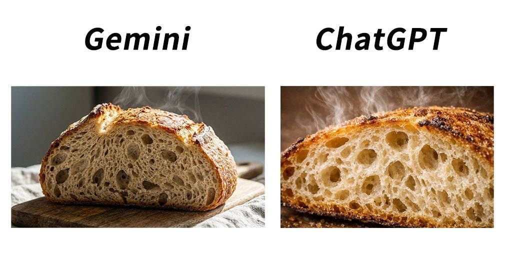 ▲Gemini善於繪製美食圖片,加上繁體中文能力可以用於繪製食譜或海報。▲ChatGPT更強調提示詞的內容,圖片偏向廣告特寫呈現,但略有AI的感覺。▲Gemini和ChatGPT都能呈現麵包剛出爐時的氣孔和煙霧。Gemini更注重圖片整體,ChatGPT則是重點強調。