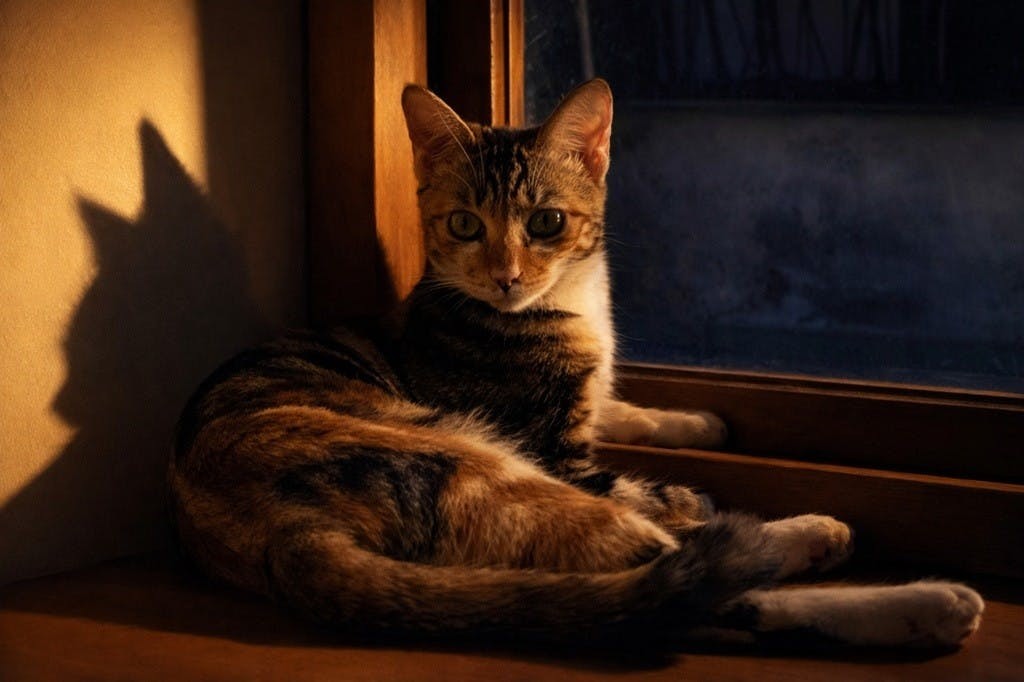 修改圖片。 將時間改為夜晚,有燈光從貓咪的左側斜斜照射,映出影子。