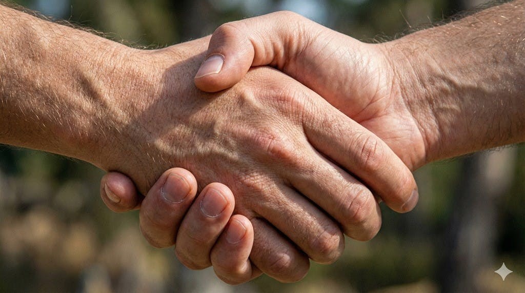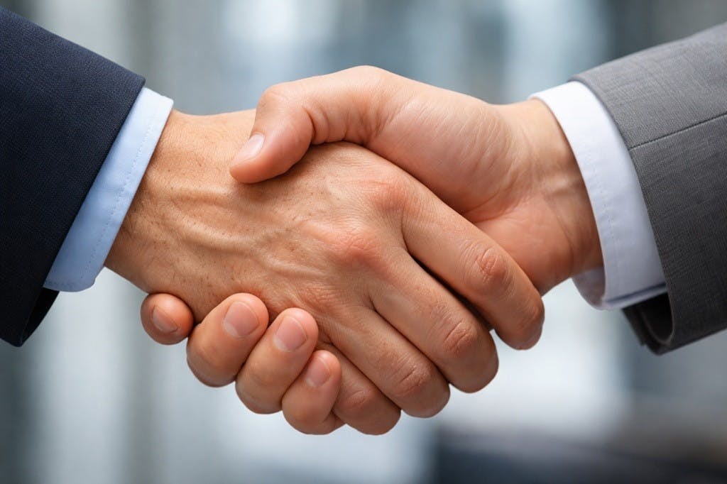 兩個人握手的特寫鏡頭,每隻手都有清晰的五根手指,並展現真實的皮膚紋理與毛孔。