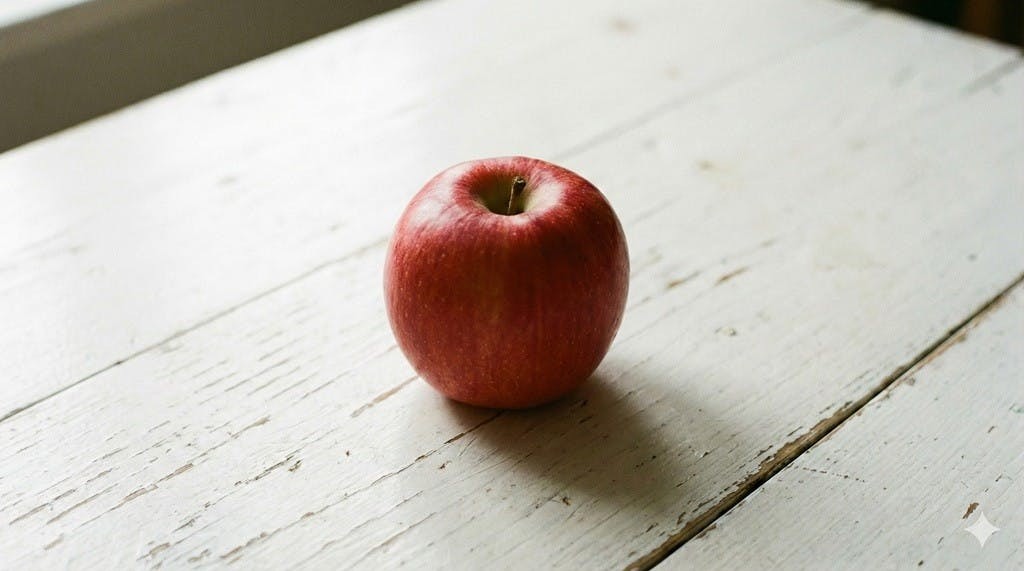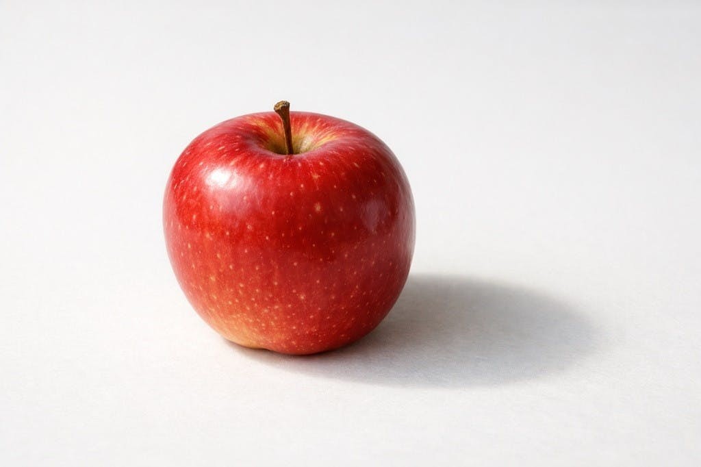 一顆紅色蘋果放在白色桌面上,光源從左上方照射,右下方產生柔和陰影,整體色彩自然、不過度鮮豔。