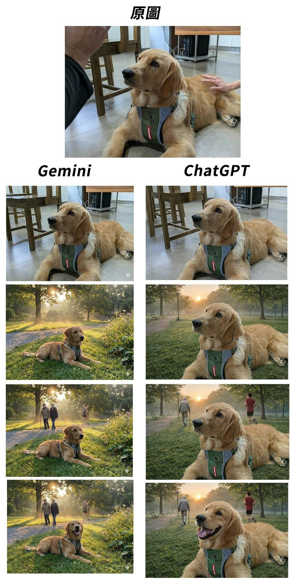 ▲嘗試使用多個步驟修圖,測試在多步驟修圖時Gemini和ChatGPT是否能保持內容一致。▲Gemini第一步驟修圖能夠確實達成指令,並且成功判斷出左側的物品是椅子。▲Gemini在第二步驟換了相似但不同的狗,而且為了圖片的合理性改了比例與構圖。以圖片的合理性與美觀來說Gemini有顧慮到,但若你只是要改圖,Gemini容易因為圖片的合理性而動到太多東西反而不適合。▲繼續執行第三步指令,在符合Gemini美感要求下,Gemini能夠僅依照指令添加元素,不再更動主體。▲第四步指令可以確實完成。▲ChatGPT第一步驟同樣可以達成指令,不過無法判斷出左側是椅子,因此修補失誤。▲ChatGPT順利達成第二步驟指令,雖然在自行繪製的內容上較弱,但能夠正確繪製。▲ChatGPT能夠保持圖片一致並依照指示添加內容。不過看得出明顯的AI痕跡,也出現少許錯誤。▲進行到第四步驟仍然能夠保持主體穩定,並有不錯的修改效果。▲在多步驟修改方面,ChatGPT的表現比Gemini更穩定。Gemini偏重畫面的合理性跟構圖美感,會在滿足條件的情況下做出它認為合理的改變,但若你沒下足條件就可能導致改掉你要保留的東西,就像是例子中換了條狗。ChatGPT則是盡量不額外創作,即便改圖不合理也是給你,就像是第一步驟的椅子,改出來的圖片不論好不好看或構圖,很容易看出來是AI或合成圖。