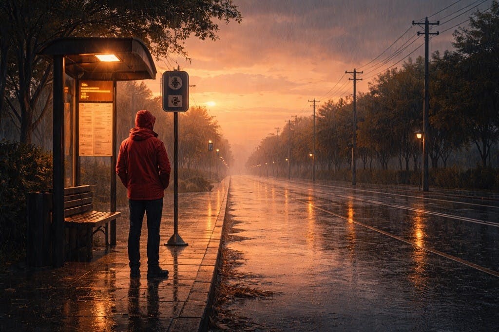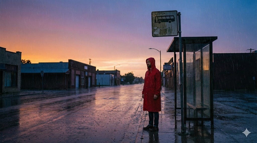 一名穿著紅色雨衣的男性站在公車站牌旁,時間是黃昏,天空下著小雨,街道上沒有任何車輛,畫面中不可出現其他人物。
