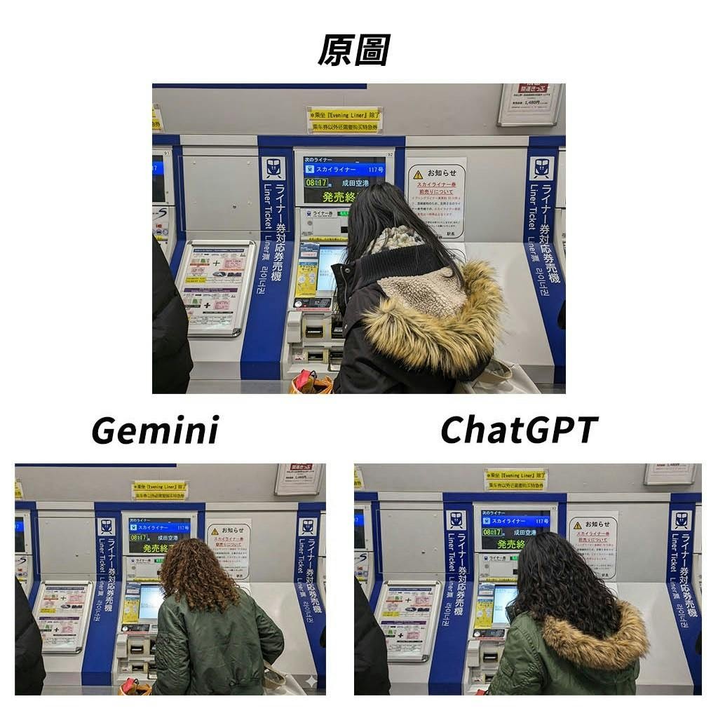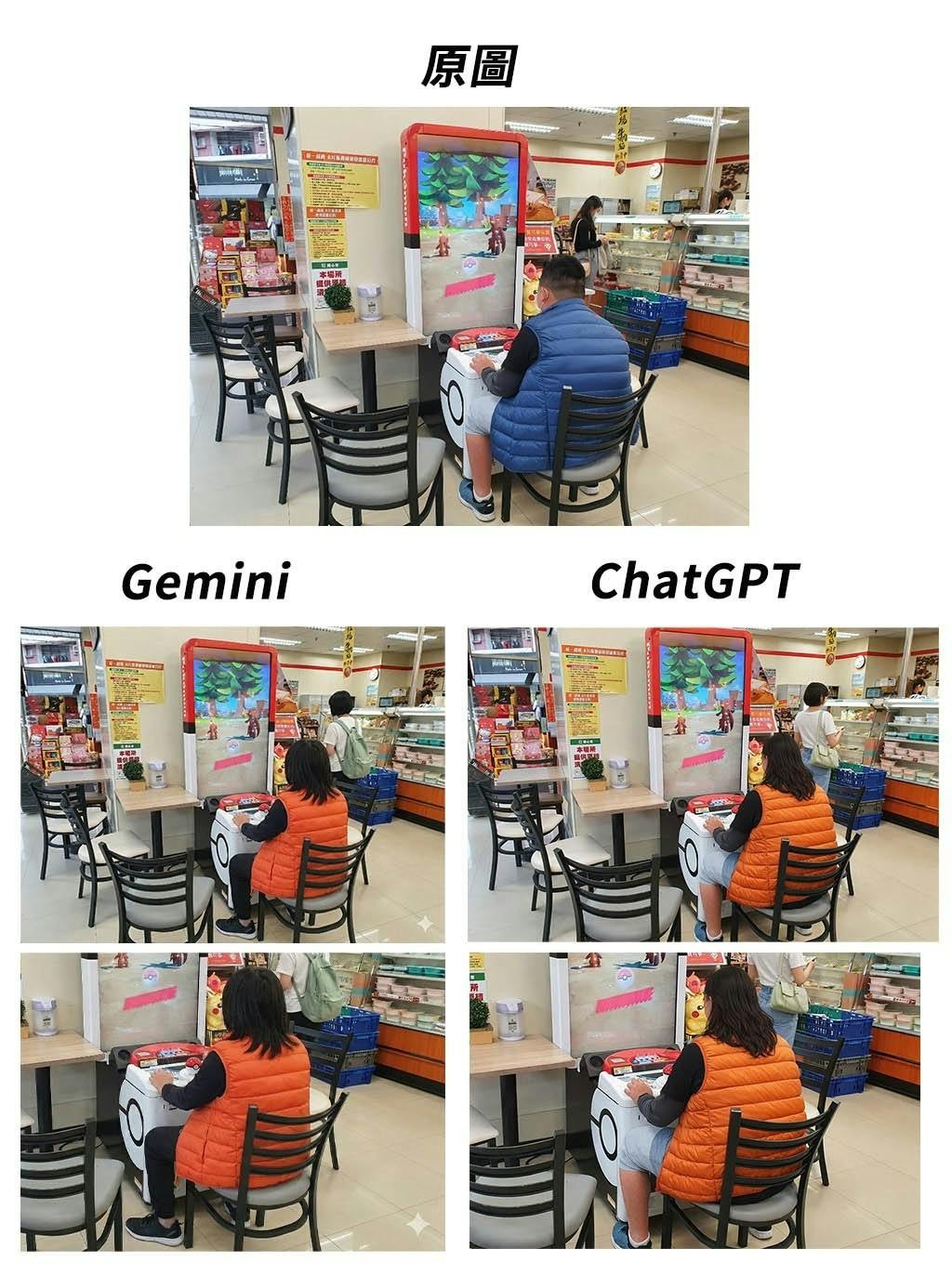 ▲嘗試使用AI修改複雜場景中的細節。▲Gemini的呈現大致正確,不過圖中男孩的體型、背心以外的服飾也被修改。圖片右側的女性雖然達成提示詞要求,但與原圖完全不同。這種改法可能會導致與你的需求不符,在提示詞的部分可能需要強調保留原人物與方向。▲ChatGPT修正較細緻,精準地僅修改男孩的髮型、背心顏色。至於右側女性雖然不是基於原圖修改,但有滿足提示詞條件並且保持面對方向。▲複雜內容修改上,ChatGPT能夠完成比Gemini更細緻的操作。Gemini修改時偏向它認為的圖片合理性而非單純的修改,可能改變的幅度會超過用戶預期,但照片仍保有合理性。
