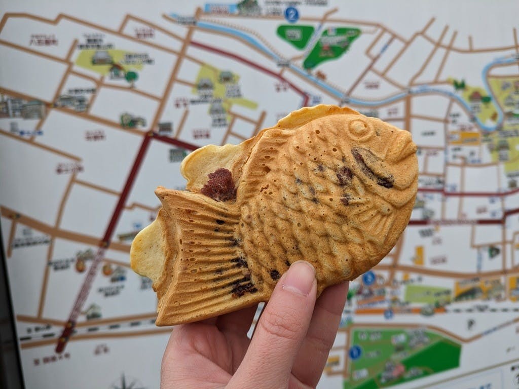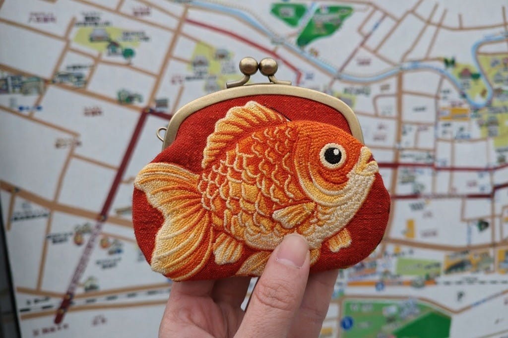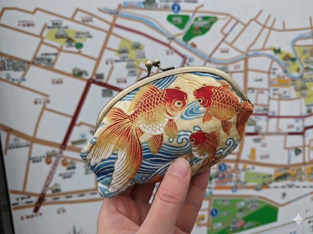提示詞:修改這張照片。將鯛魚燒改成有金魚圖案的布錢包。
