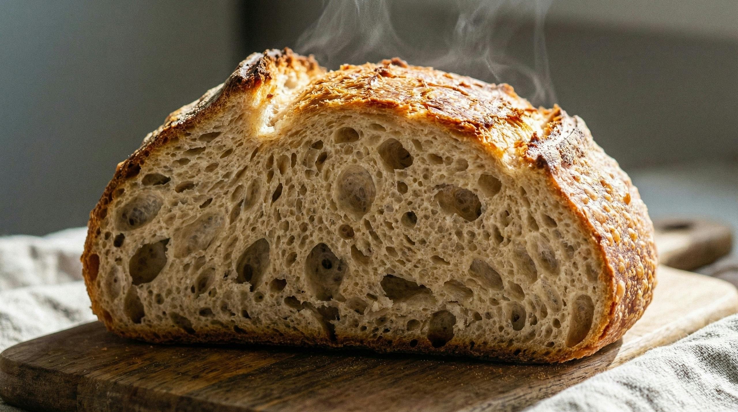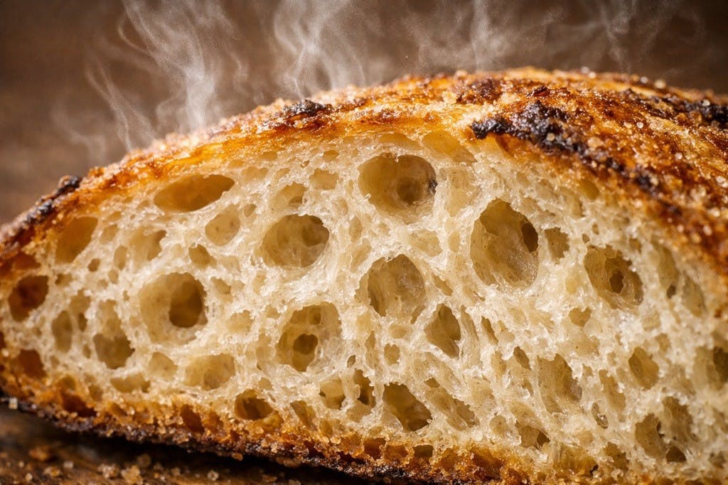 一片酸種麵包切片的微距攝影,展現其中的氣孔、冒出的熱氣以及金黃酥脆的外皮質感。