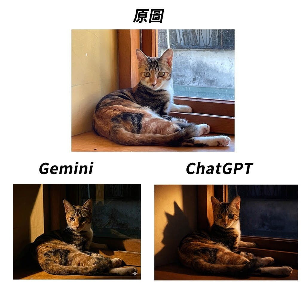 ▲以此圖為例,讓Gemini和ChatGPT分別修改圖片的時間與光線。有趣的是,我們故意下指令說燈光從貓咪左側照射,讓AI去判斷屁股與臉同時朝向你的貓,究竟何者是左邊。▲Gemini的圖片富有表現力,在美感、光影、細節上相當出色。但繪製成果不一定能滿足所有要求。Gemini認為貓的左側是牆面,因此部分光線從牆面方向打來。且AI認為暗處或夜間貓瞳孔應該會放大,因此可以看到瞳孔放大的細節。▲ChatGPT更傾向保留原圖,並以達成指令為第一優先。在本次測驗中,原本的預想更接近ChatGPT的理解,在牆壁上有明顯的貓咪影子。ChatGPT認為貓的左側是以頭部為主,因此光線從窗側打來,並將影子投到牆面上。▲簡而言之,Gemini可能會為了圖片整體的合理性與美感調整圖片,例如調整瞳孔符合暗處的情況,而ChatGPT更傾向保留用戶的資訊,無論修改還是繪製都較為保守。