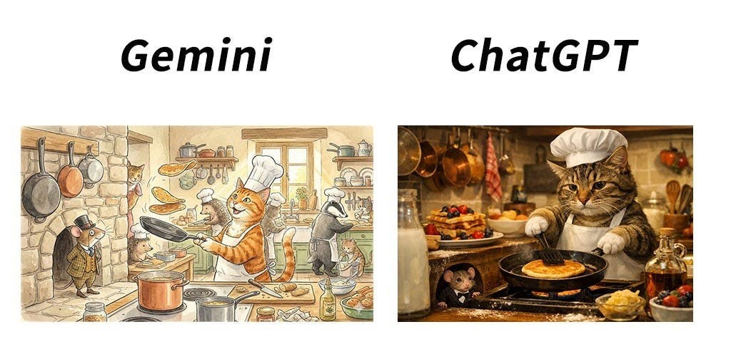 Gemini的Nano Banana Pro推出後掀起AI繪圖革命,但ChatGPT並非完全沒有優勢。感覺Gemini因為繪圖能力非常優秀,對於圖片整體的要求更甚於指令,Gemini能夠用豐富的資料補足提示詞沒有說明的部分,但也因此容易創造出條件之外的物件或細節。至於ChatGPT雖然也能夠理解用戶的複雜要求,但因為繪圖能力尚未跟上,和Gemini相比較為弱勢,不過它更服從指令,不會為了圖片的整體表現添加過多未提及的內容。