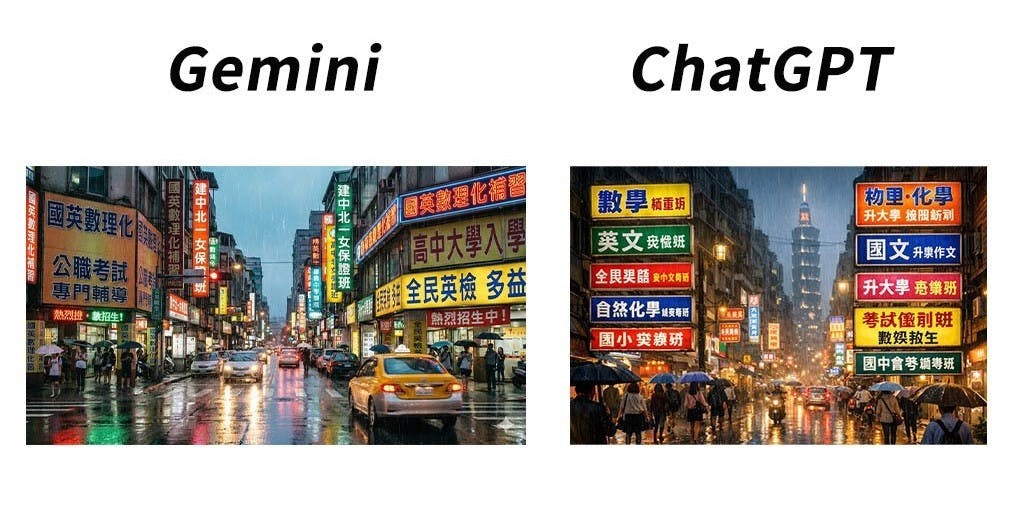 ▲Gemini能夠在圖片上顯示清楚的繁體中文,加上資料整理能力,讓它適合製作資訊圖表或宣傳海報。某些方面來說,路口有計程車紅燈闖過去也很寫實。▲ChatGPT目前仍然無法繪製正確的繁體中文圖片,且招牌的排列方式不符現實環境。▲ChatGPT的繁體中文是最大缺點,撇去圖片兩側的錯誤招牌,圖片中間部分仍然有繪製準確的台北街景。