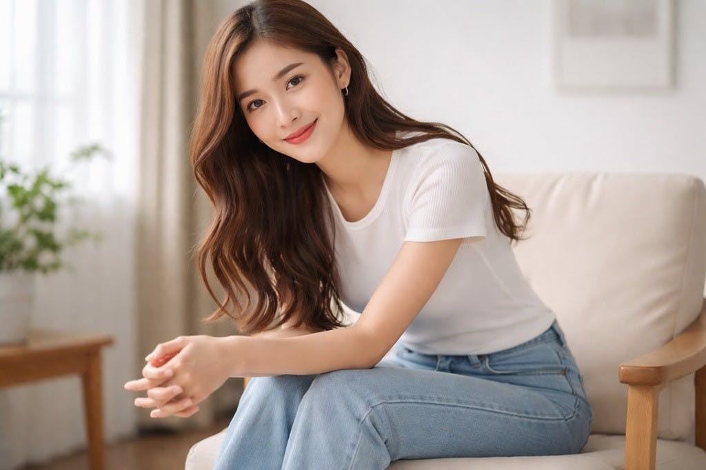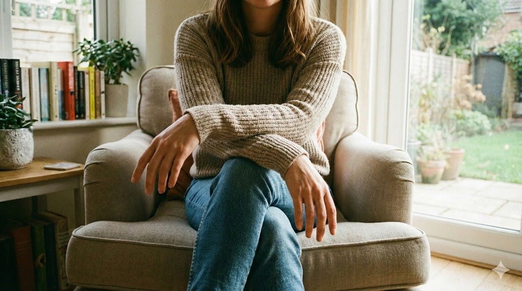一名女性坐在椅子上雙手交叉放在膝蓋上,手指自然彎曲,身體微微前傾,姿勢放鬆且符合人體結構。