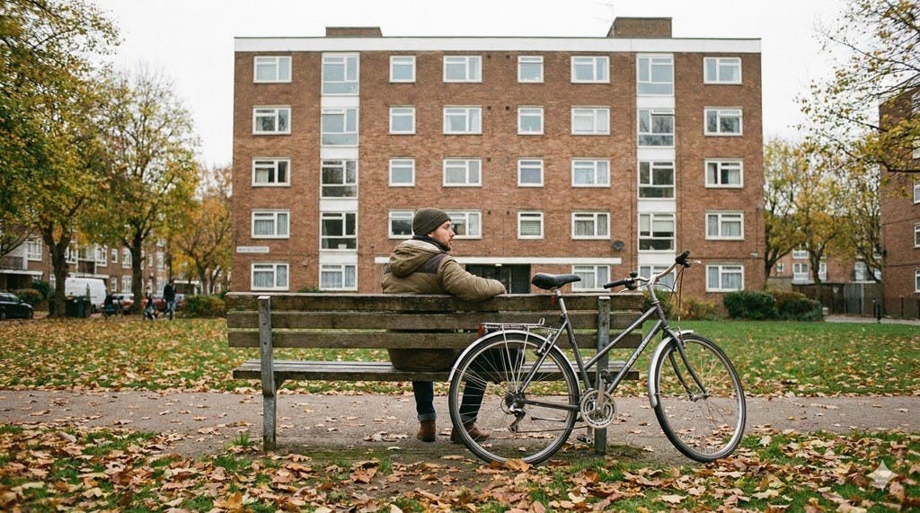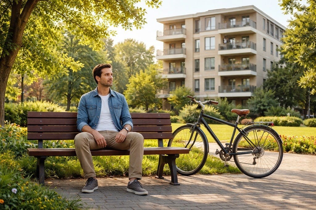 一名成年人坐在公園長椅上,身旁放著一輛正常尺寸的腳踏車,遠方有一棟五層樓高的住宅建築。