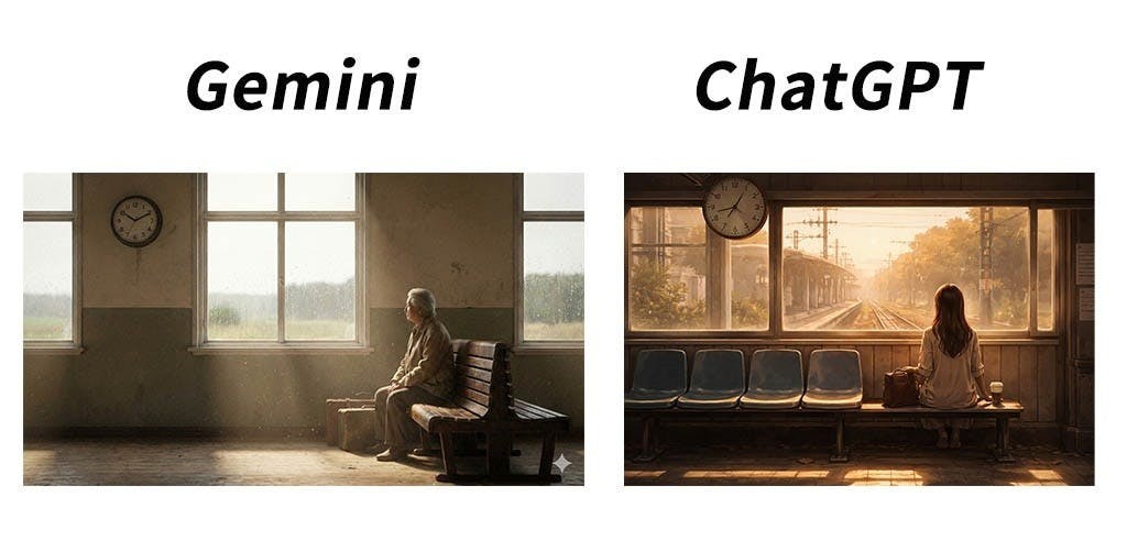 ▲在氛圍表現上,Gemini能夠自行挑選元素並繪製。圖片中的時鐘能夠正確顯示,且取巧地顯示為最常見的10點10分,可能與Gemini學習大量商品圖片有關▲ChatGPT特別強調氛圍,在元素挑選上沒有失誤。不過ChatGPT繪製的時鐘出錯,且空間感怪異,座椅看似靠牆擺放,但旅客卻又把腳放在牆面。另外構圖方面也不太合理,鐵軌直接朝向建築方向,且位於相同平面上,容易看出是AI想像的圖片。▲Gemini和ChatGPT都能理解並正確繪製抽象的指令,但在繪製上Gemini強上不少,能正確且合理做出適合的圖片配置,ChatGPT若沒有明確指示,在空間感與構圖上容易出錯。