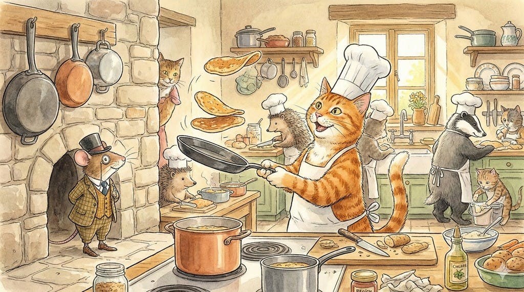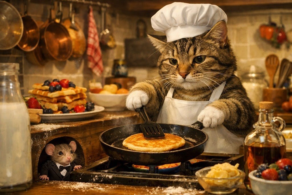 熱鬧的廚房場景:一隻戴著廚師帽的貓正在翻動鬆餅,而一隻穿著微型西裝的老鼠從洞口觀看。