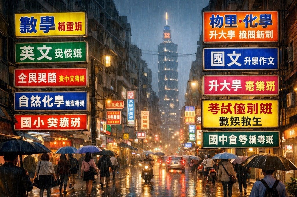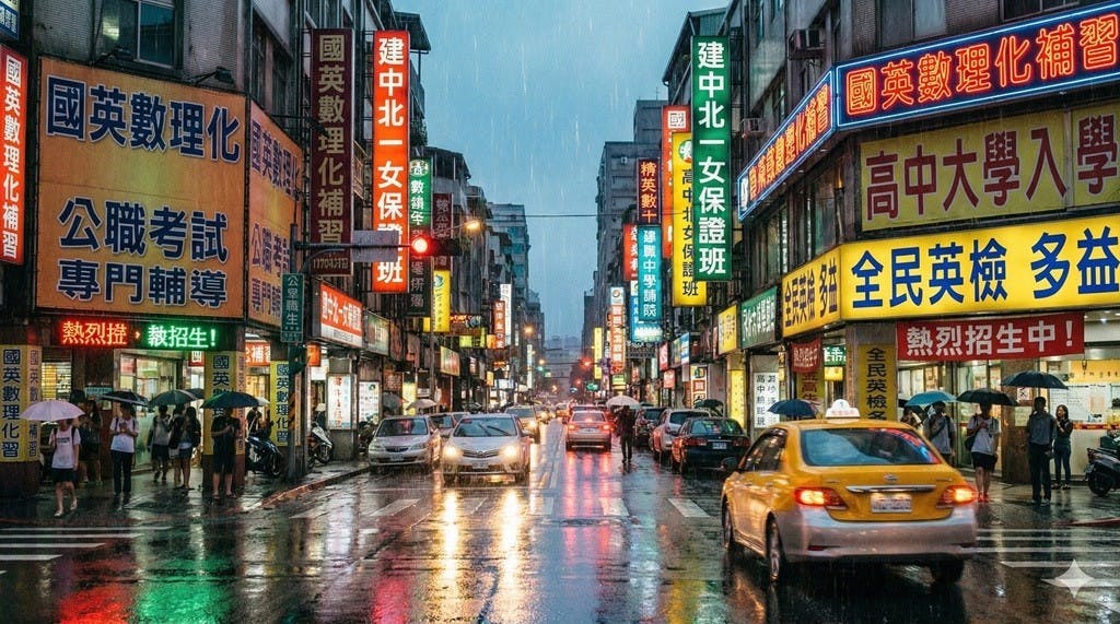 在下雨的台北街道上,有許多補習班招牌掛著,上面寫著各個科目補習和招生資訊。字體用繁體中文。