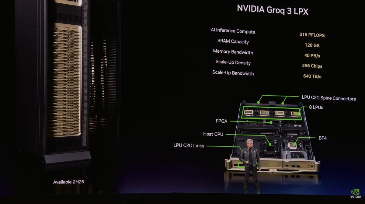 同時將Groq LPU進行大規模叢集部署時,可視為一個單一巨大晶片;單一個Groq LPU機架具備256個Groq處理器,並有高達128GB、達640GB/s可擴展頻寬的SRAM(不是RAM而是位於晶片前端SRAM!),當Groq LPU機架與Vera Rubin NVL72機架結合,Rubin及Groq可協同運算每個輸出標記的每一層AI模型,解碼速度更為提升。