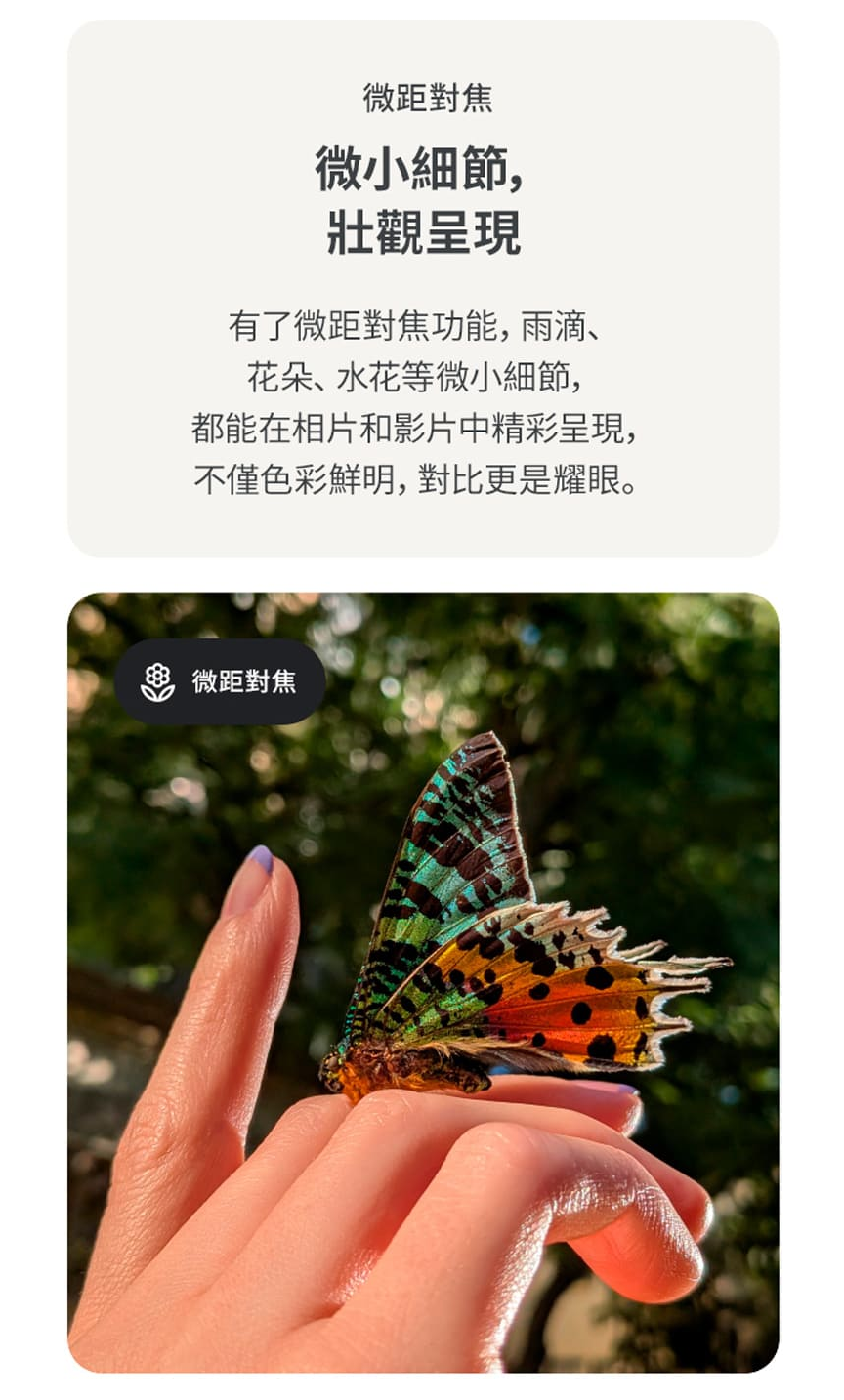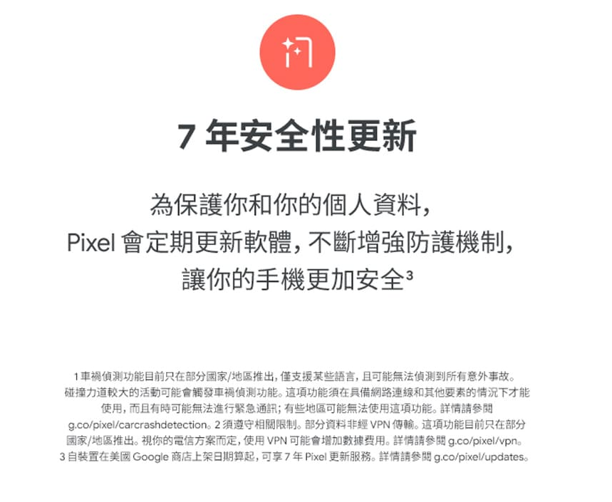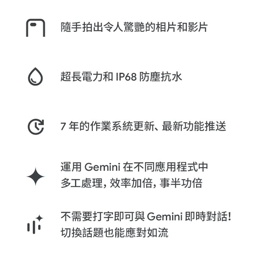 ▲支援IP68防塵防水、並且有長達7年系統更新。▲Pixel系列的特點就是能使用Google最新的技術,像是一起拍功能。▲支援微距拍攝,拍攝小東西或美食特別方便。▲電池續航力很長,官方續航力數字超過24小時。▲擁有7年系統更新是它的賣點之一。