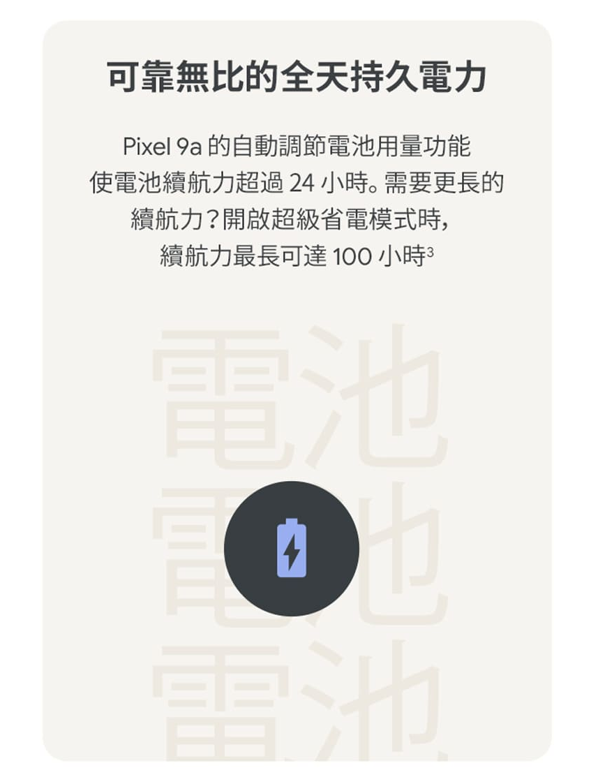 值得注意的是Google特別強調電池續航力超過30小時,也遠超過Google 9官方聲稱的24小時,這是受惠於電池容量達到5,100mAh,比起Pixel 9的4,492mAh增加許多、甚至略高於Pixel 9 Pro XL的5,060mAh。